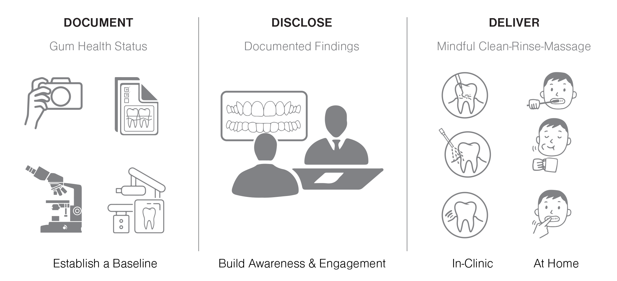 Perform Clean–Rinse–Massage (CRM) twice daily. Mindful execution—gentle, thorough, and attentive—enhances circulation, disrupts bacterial biofilm, and promotes natural gum healing.