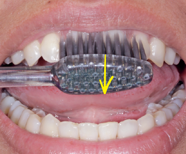 थोरै फ्लोराइडयुक्त मञ्जन हाली ब्रशले १ मिनेट मालिस गर्ने